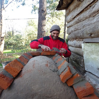 Et puis, comme prévu, et après quelques imprévus, Fede, notre ami de Villa Serranna, est bel et bien venu nous voir pour construire le fameux four. Après avoir reporté une première fois sa venue faute de moyen de transport, il est finalement parti avec un ami mais a du endurer une bien triste journée, tombant en panne à vingt kilomètres de chez nous, devant attendre la journée durant une dépanneuse, qui le laissera finalement près de l'aéroport de Montevideo – vingt kilomètres dans l'autre sens – et faisant 10 kilomètres à pied en pleine nuit pour rejoindre la maison de sa mère. Mais rien de quoi le décourager : il arrivera chez nous le lendemain après avoir fait 20 kilomètres à vélo, refusant même un verre d'eau à son arrivée, affichant toujours une sérénité déconcertante. Tout ça pour nous aider à construire ce four, gratuitement. Il sera accompagné de Pablo, autre volontaire rencontré à Villa Serranna, dont nous avions bien senti l'envie lors de nos correspondances sur la Toile de venir nous rejoindre pour ce chantier. Accompagné de Nando, le compagnon d'Aude, c'est donc toute une équipe qui mettra la main à la pâte et les mains dans la terre. En deux jours, pour un budget de 30€, beaucoup de débrouille, un peu de récup' et une direction des opérations menée de main de maître par Fede, le four fut monté. Il a quand même fallu une séance particulière de torture : la technique artisanale remplaçant la bétonneuse, qui consiste à mélanger le sable et l'argile en l'écrasant avec les pieds, est beaucoup, beaucoup plus agréable sous 40° que sous 6°, avec une eau venant des dernières pluies, devant avoisiner les 0°. J'ai du rester une petite heure à barboter, et ai du mettre la journée avant de sentir de nouveau mes doigts de pied. Sport à haut risque aussi.