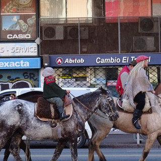 Comme trois semaines auparavant, c'est la pluie qui accompagna notre trajet jusqu'à l'aéroport, et cette fois, ce sont des larmes qui accompagneront Maïa à notre retour à la maison. Elle s'était évidemment habituée à la présence de ce bout de famille importé, et ce fut d'autant plus compliqué de la consoler que ce retour à la maison sous la pluie, après la magie d'Iguazu, ne nous enchantait pas plus que ça non plus. Mais comme souvent, tout s'est amélioré avec le soleil. Il revint deux jours plus tard, pour une des deux fêtes de l'Indépendance – car dans le pays du carnaval le plus long, les excuses pour faire la fête sont légion. Alors que nous étions à Montevideo pour un concert la veille, nous rencontrons un défilé sur une des principales rues de la ville, la bien nommée 18 de julio. Ici, point de garde montée ou d'exhibition de la puissance militaire de la nation, mais une armée de gauchos chevauchant leur canasson, défilant avec leurs habits du quotidien, donc parfois en jogging, criant avec vigueur « viva la Patria! » Des gauchos de tous âges, dont des bambins pas plus grand que Maïa montant seuls, et fiers, leur cheval. Et pas de camion fou, ni sur cette avenue, ni à Marindia. L'insécurité n'est pas toujours là où croit.